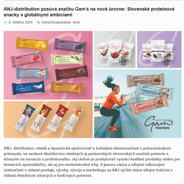 ANJ-distribution, a young and dynamic company with extensive experience in the food industry, specializes in distributing its own and partner Slovak food brands with a focus on innovation and professionalism. Its mission is to deliver high-quality products not only to local consumers but also to international markets. With a clear vision and strong expertise in sales, production, development, and marketing, ANJ is quickly becoming a significant player in the distribution of healthy and functional foods.